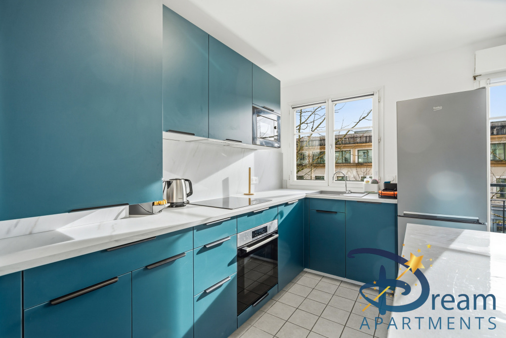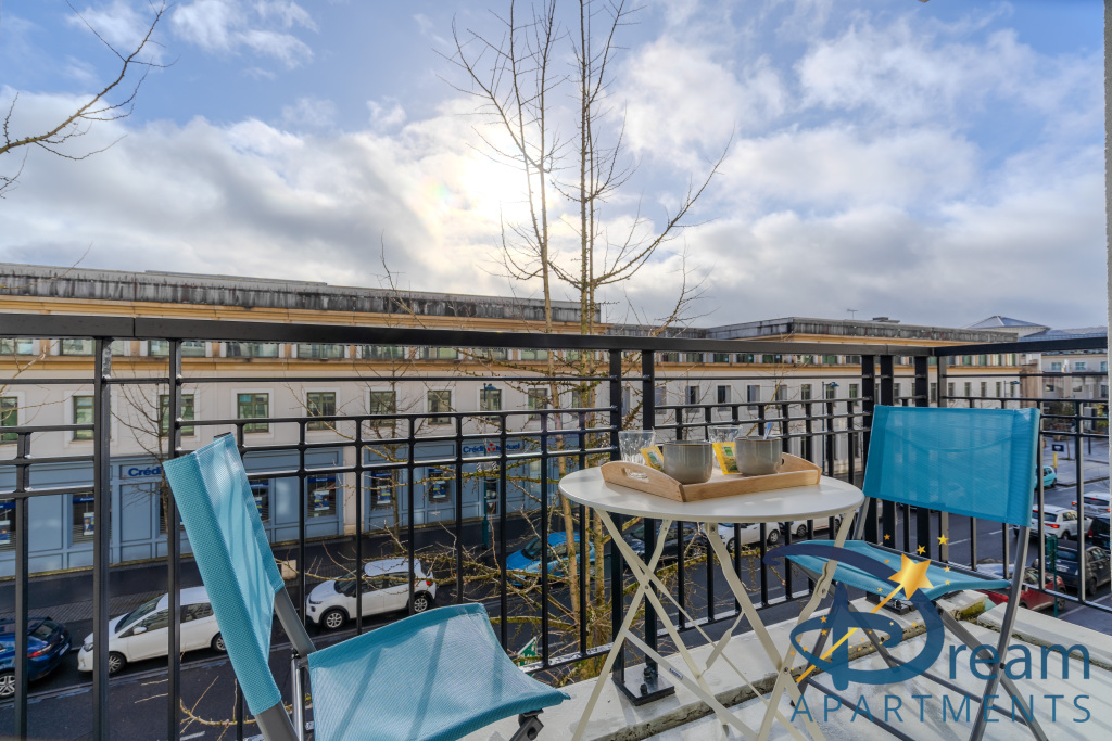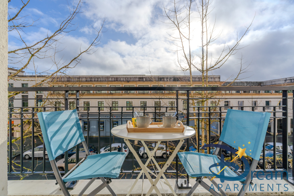 Côté nuit, vous disposerez de deux chambres confortables, chacune dotée de rangements, offrant calme et intimité. La literie a été choisie avec soin pour garantir des nuits reposantes après vos journées de visite ou de shopping. Une salle de bain moderne et des WC séparés viennent compléter ce logement fonctionnel et bien pensé.