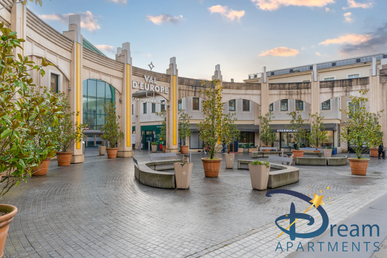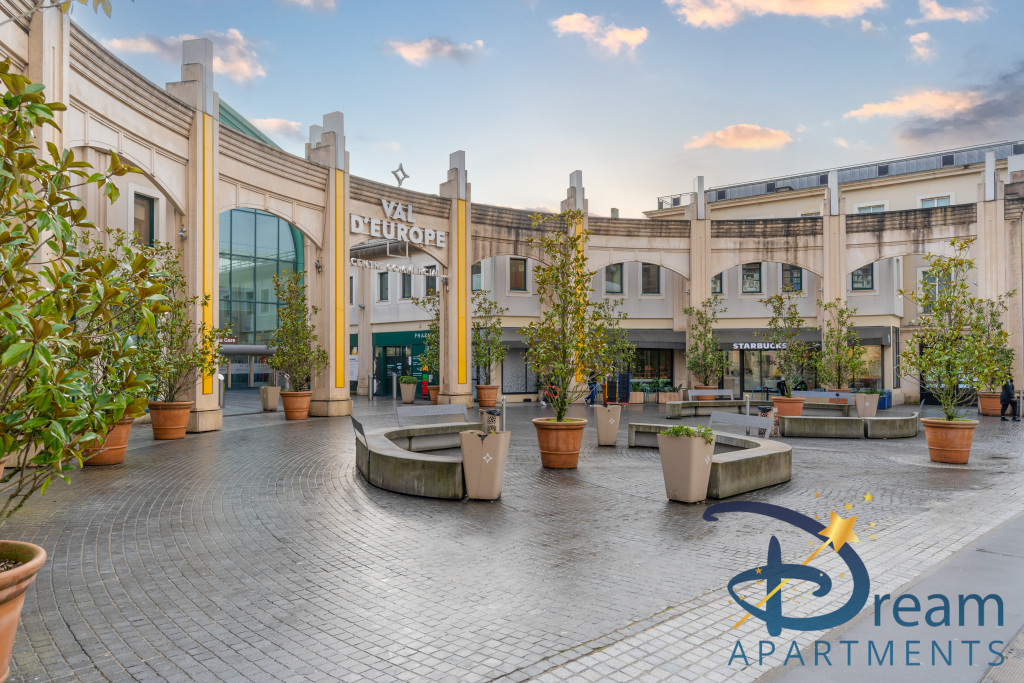 Situé en face du centre commercial Val d’Europe, l’un des plus grands d’Île-de-France, l’appartement bénéficie d’un emplacement exceptionnel. Vous profiterez d’un accès immédiat aux boutiques, restaurants, supermarché, aquarium Sea Life, ainsi qu’à toutes les commodités du quotidien. Le RER A est accessible à pied en seulement 2 minutes, vous permettant de rejoindre Disneyland Paris en une station ou Paris centre en environ 40 minutes.